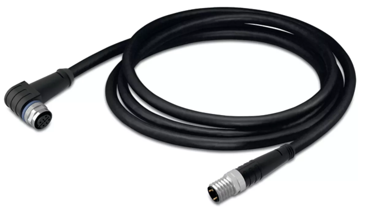 przewód do czujników/elementów wykonawczych; M12A gniazdo kątowe; M8 wtyk prosty; 4-bieg.; długość 5 m