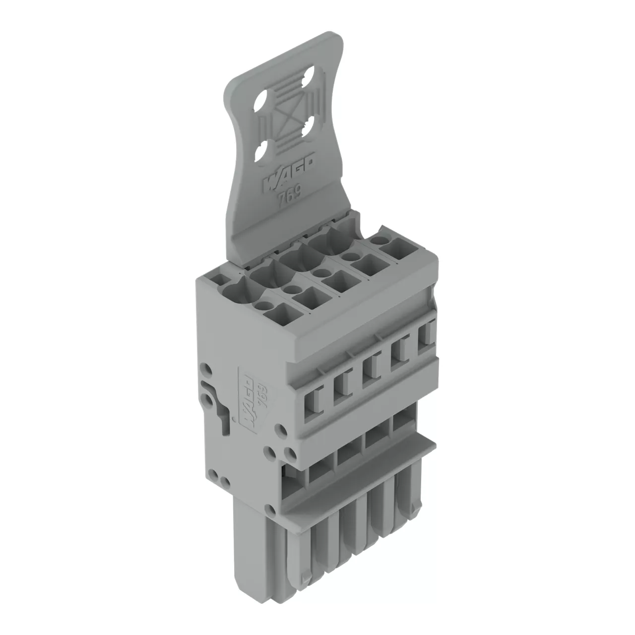 gniazdo 1-przewodowe; CAGE CLAMP®; 4 mm²; raster 5 mm; 5-bieg.; wypust kodujący; środkowy zaczep ryglujący; płytka odciążająca przewody; 4,00 mm²; szary