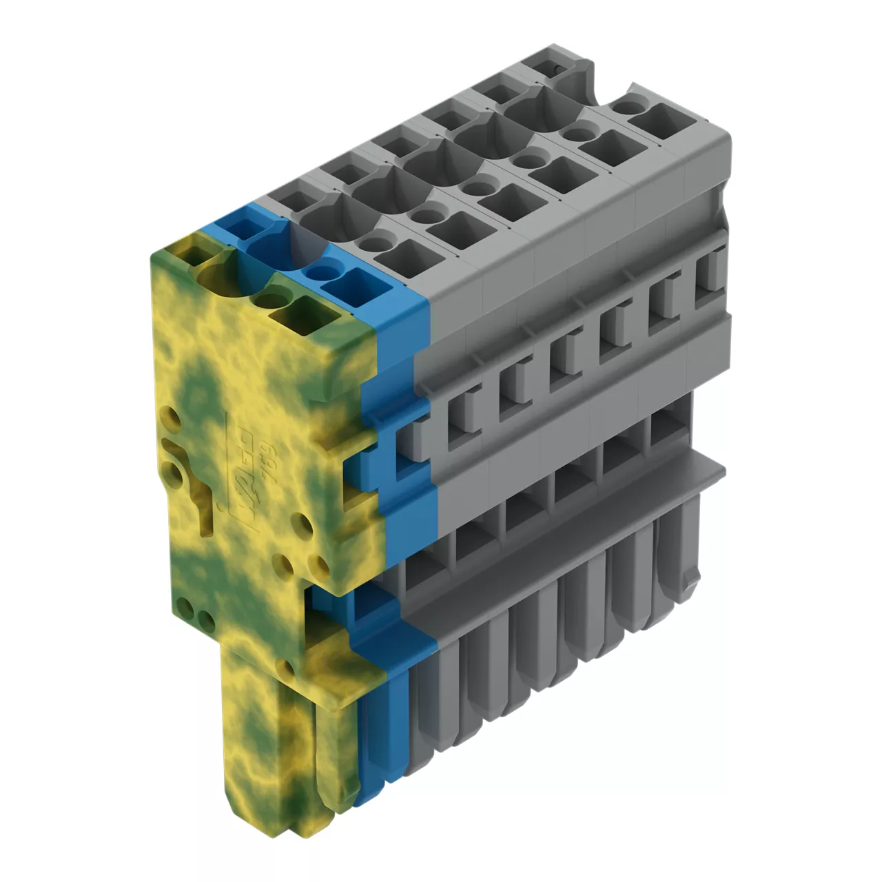 gniazdo 1-przewodowe; CAGE CLAMP®; 4 mm²; raster 5 mm; 8-bieg.; wypust kodujący; 4,00 mm²; szary/niebieski/żółto-zielony
