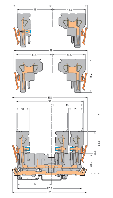 złączka bazowa 4-pinowa; z szyną ekranową; na szynę TS 35 x 15 i 35 x 7,5; szary