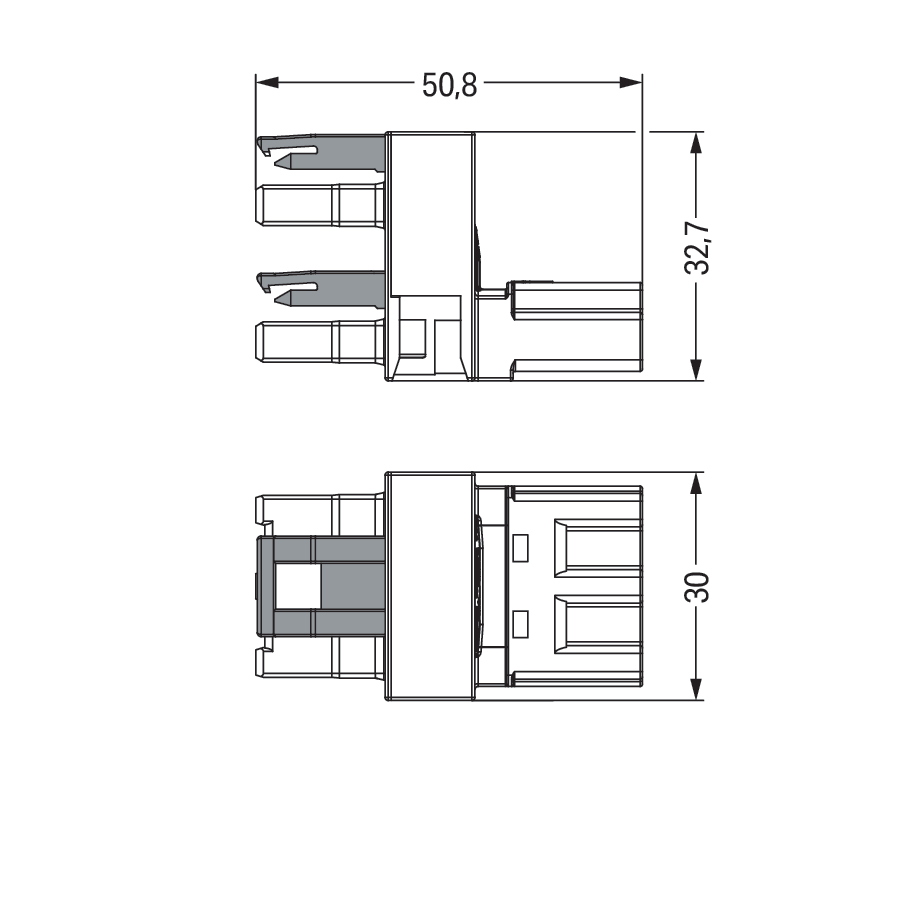 rozgałęźniki typu h; 3-bieg.; kodowanie B; 1 wejście; 2 wyjścia; odejścia jednostronne; 2 zaczepy ryglujące; szary