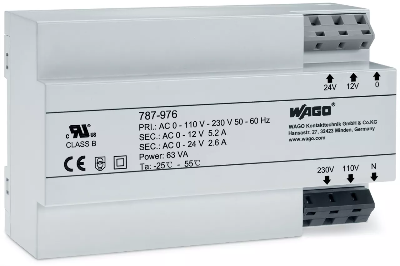 zasilacz transformatorowy; napięcie wejściowe 230 V AC; napięcie wyjściowe 12-24 V AC; moc wyjściowa 63 VA