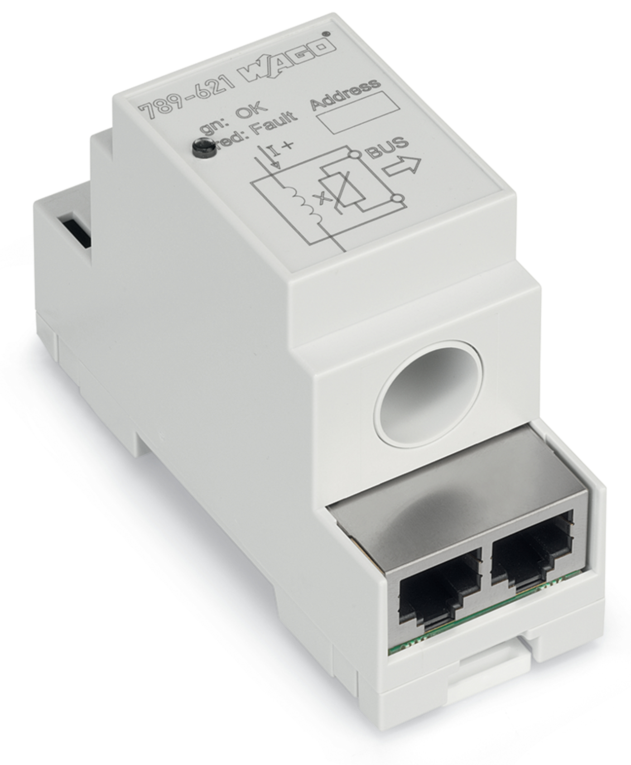 przetwornik pomiarowy prądu; prądowy sygnał wejściowy 140 A DC; MODBUS RTU; napięcie zasilania 24 V DC; szerokość 35 mm