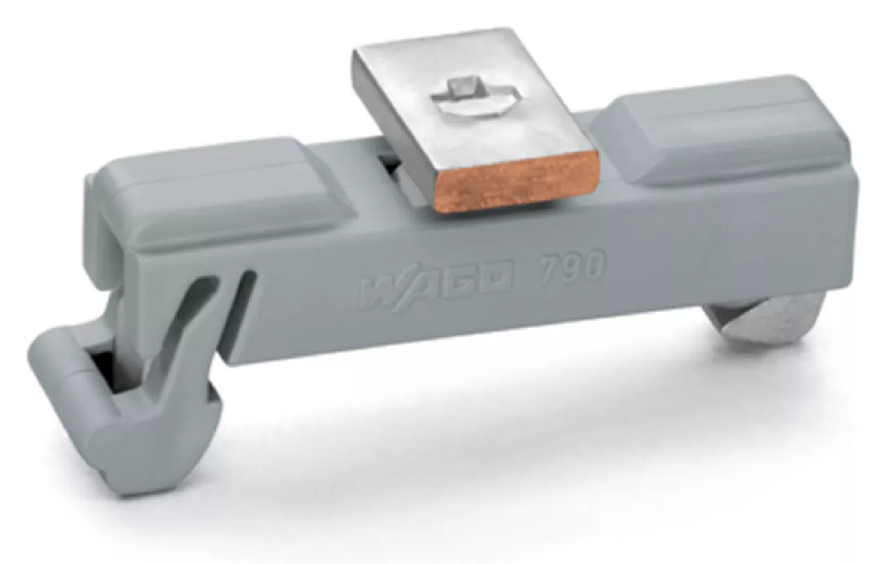szyna z przewodzącą stopką; równoległa do szyny montażowej; długość 15 mm; Cu 10 mm x 3 mm; do obejmy zaciskowej do ekranu z serii 790-108; szary