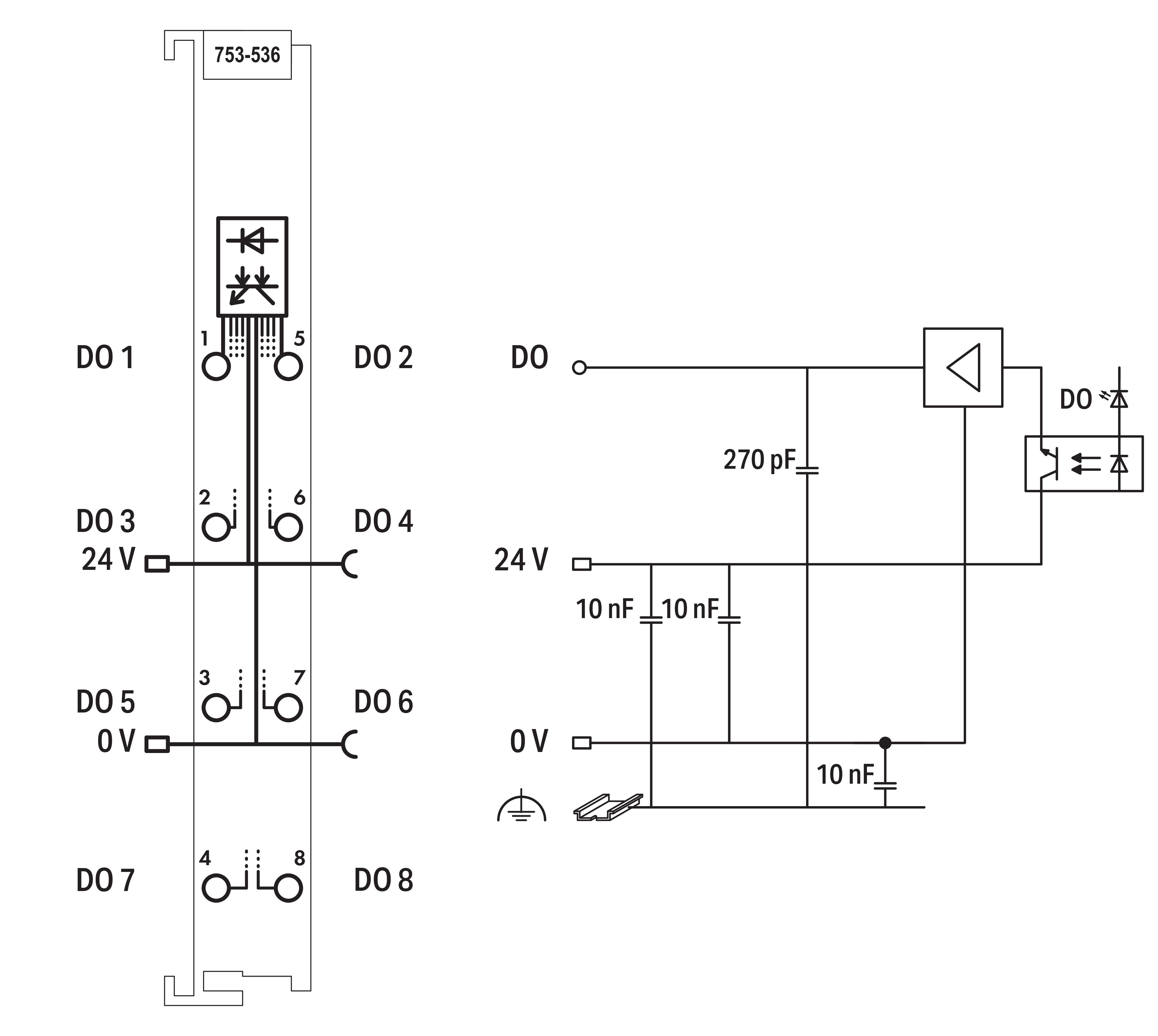 8-kanałowe wyjście dwustanowe; 24 V DC; 0,5 A; załączanie potencjałem niskim 753-536