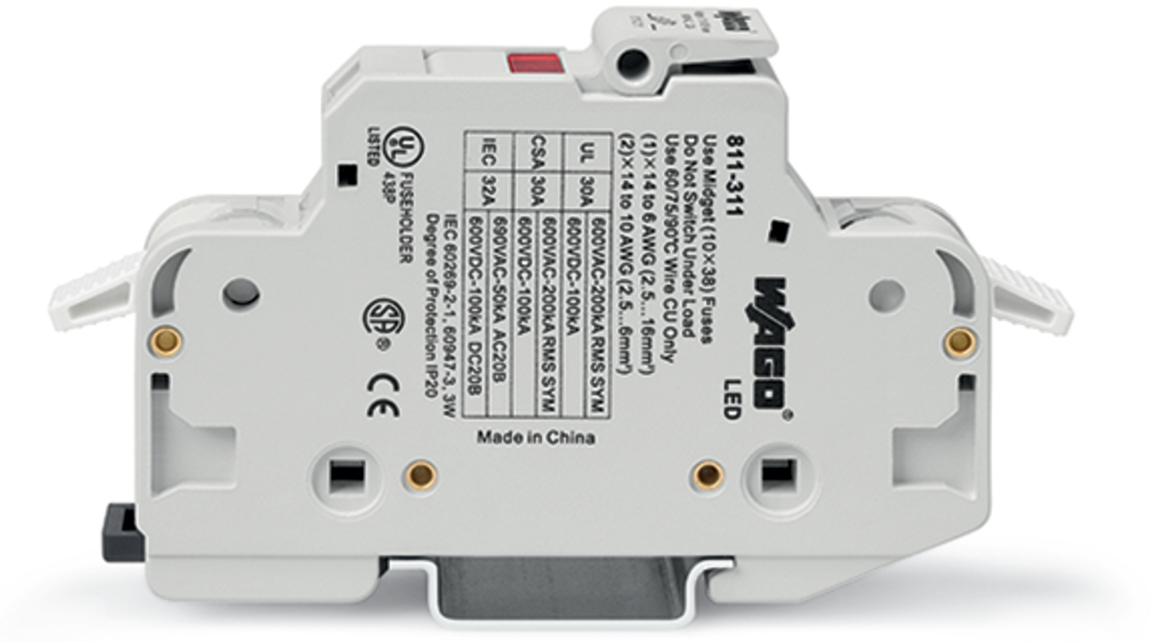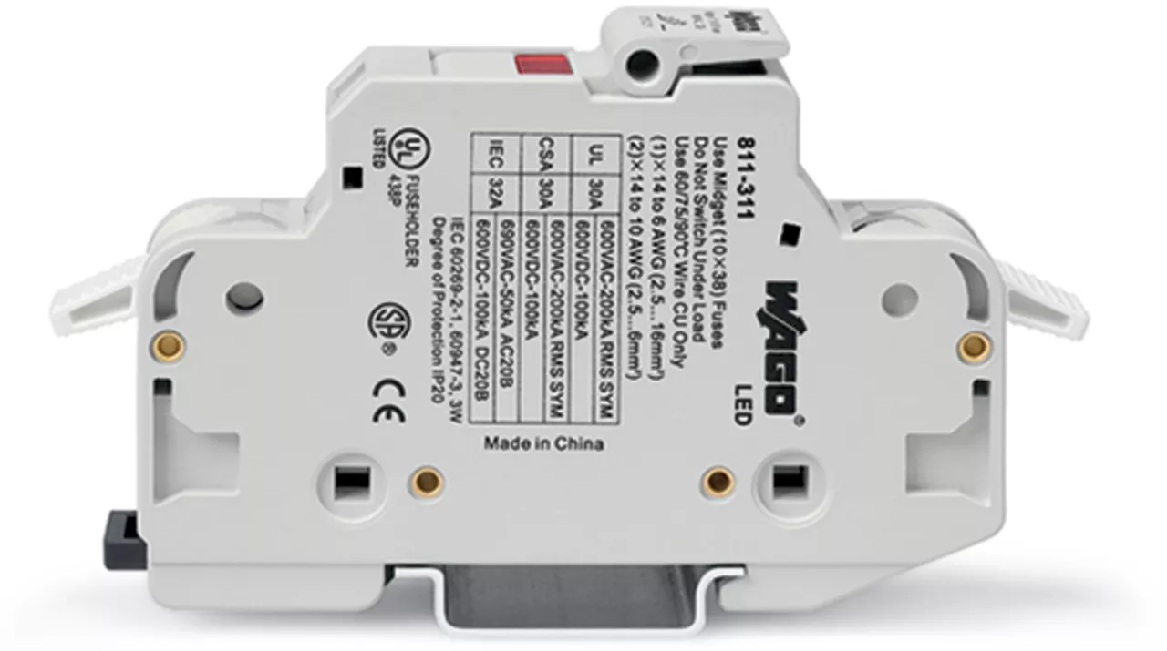 gniazdo bezpiecznikowe 2-przewodowe; do bezpieczników cylindrycznych 10 x 38 mm 13/32" x 11/2"; 1-bieg.; z sygnalizacją przepalenia wkładki; na szynę TS 35 x 15 i 35 x 7,5; 16 mm²; CAGE CLAMP®; jasnoszary