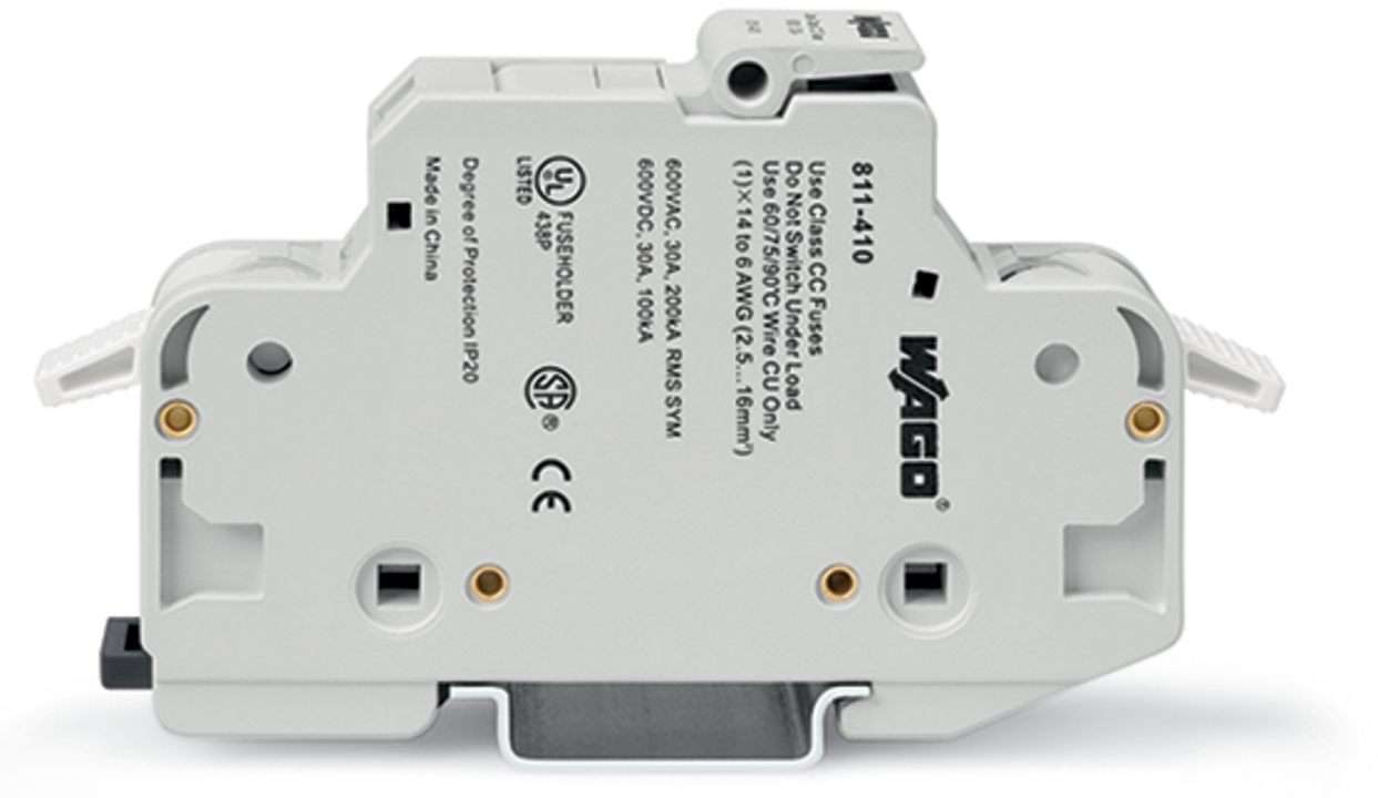gniazdo bezpiecznikowe 2-przewodowe; do bezpieczników cylindrycznych Class CC; 1-bieg.; bez sygnalizacji przepalenia wkładki; na szynę TS 35 x 15 i 35 x 7,5; 16 mm²; CAGE CLAMP®; jasnoszary