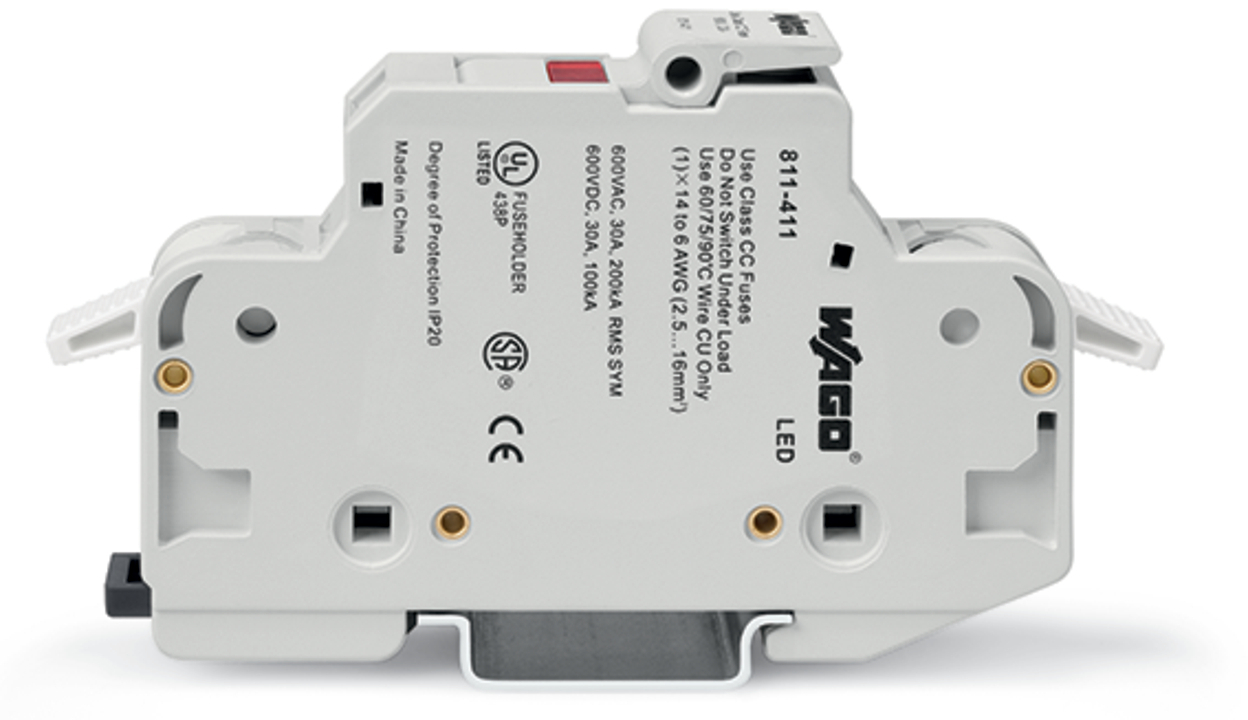 gniazdo bezpiecznikowe 2-przewodowe; do bezpieczników cylindrycznych Class CC; 1-bieg.; z sygnalizacją przepalenia wkładki; na szynę TS 35 x 15 i 35 x 7,5; 16 mm²; CAGE CLAMP®; jasnoszary