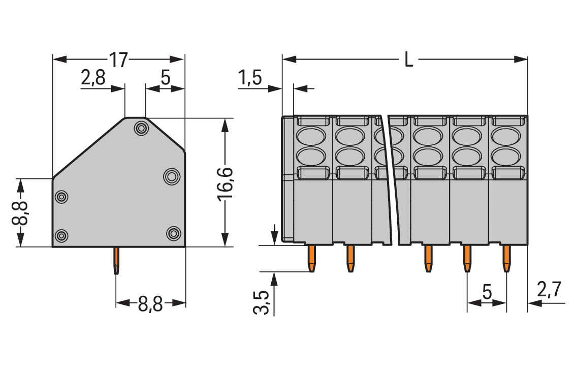 2-przew złączka do płytek drukowanych 1,5 mm² RM 5 mm 11-bieg, szara
