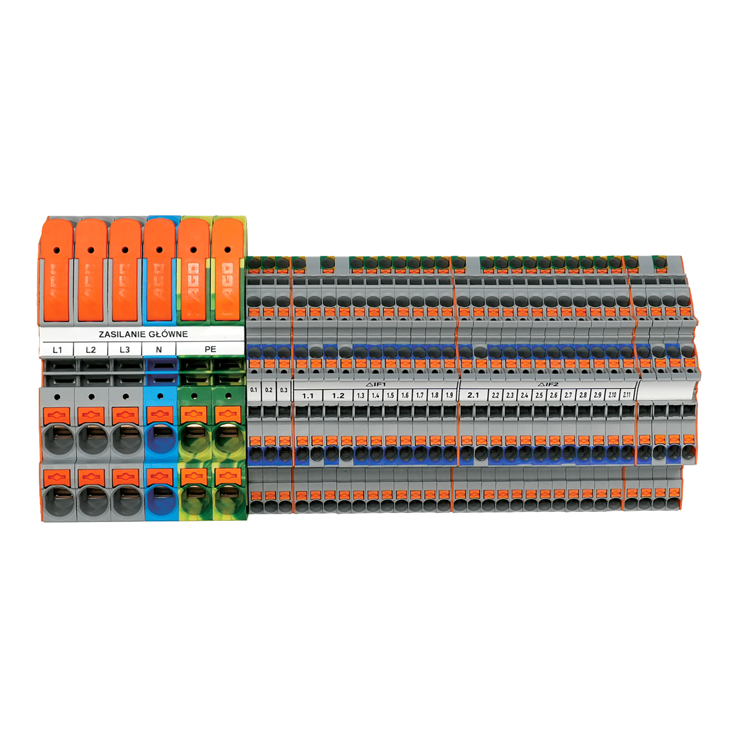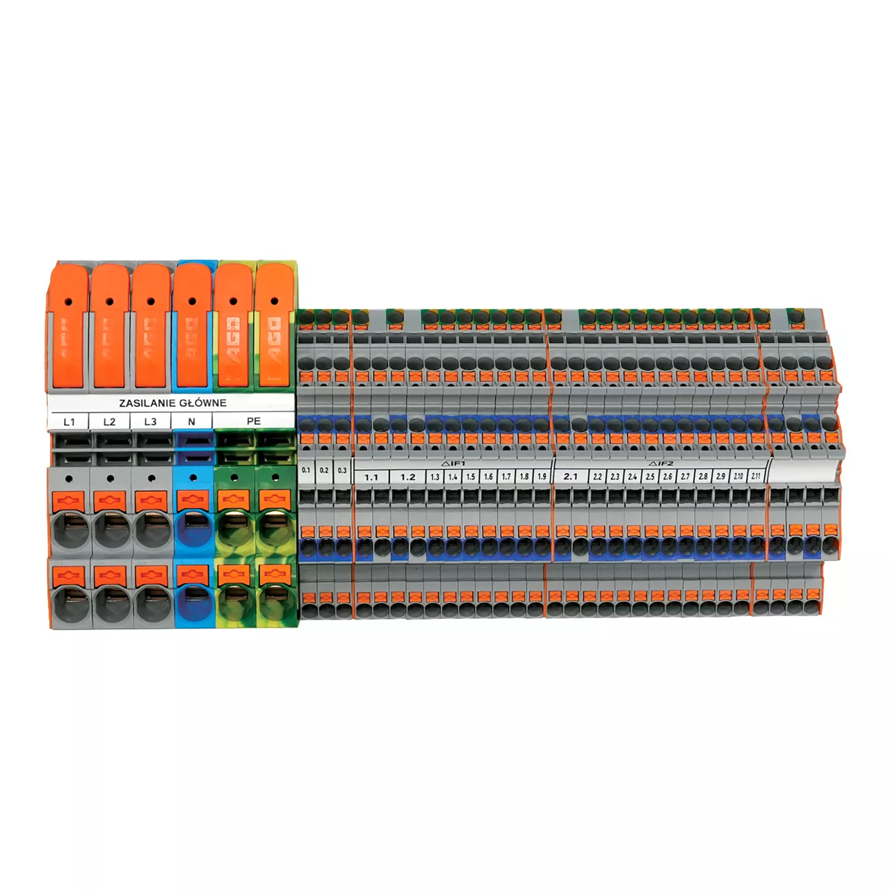 Rail-mount terminal block set; with lever and push-button; for building distribution boards; with photovoltaics and heat pumps; multicoloured