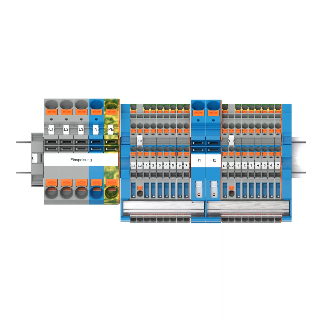 zestaw złączek listwowych TOPJOB®S do rozdzielnicy głównej przeznaczony pod zgrupowane wyłączniki różnicowoprądowe; z przyciskami