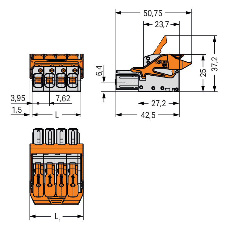 gniazdo 1-przewodowe; dźwignia; Push-in CAGE CLAMP®; 10 mm²; raster 7,62 mm; 4-bieg.; 100% ochrona przed błędnym połączeniem; środkowy zaczep ryglujący; 10,00 mm²; jasnoszary