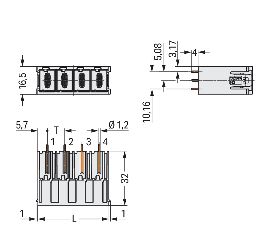 wtyk THT; pin lutowniczy 1,2 x 1,2 mm; konstrukcja prosta; 100% ochrona przed błędnym połączeniem; zestyki posrebrzane; z wypustem prowadzącym; raster 10,16 mm; 4-bieg.; jasnoszary