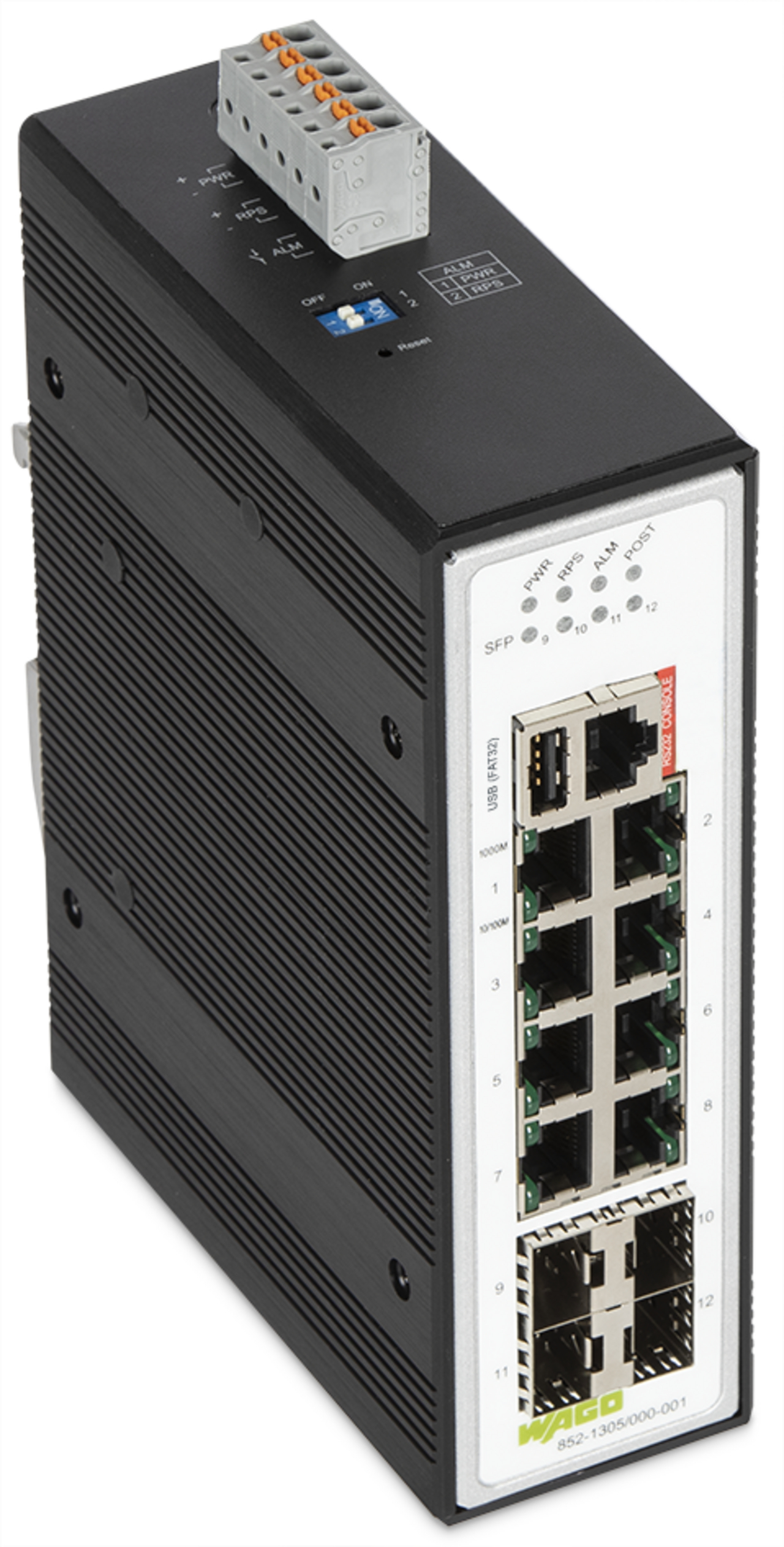 switch przemysłowy zarządzalny; 8 portów 1000 Base-T; 1000BASE-SX/LX, 4 gniazda; rozszerzony zakres temperatury; USB; czarny metaliczny