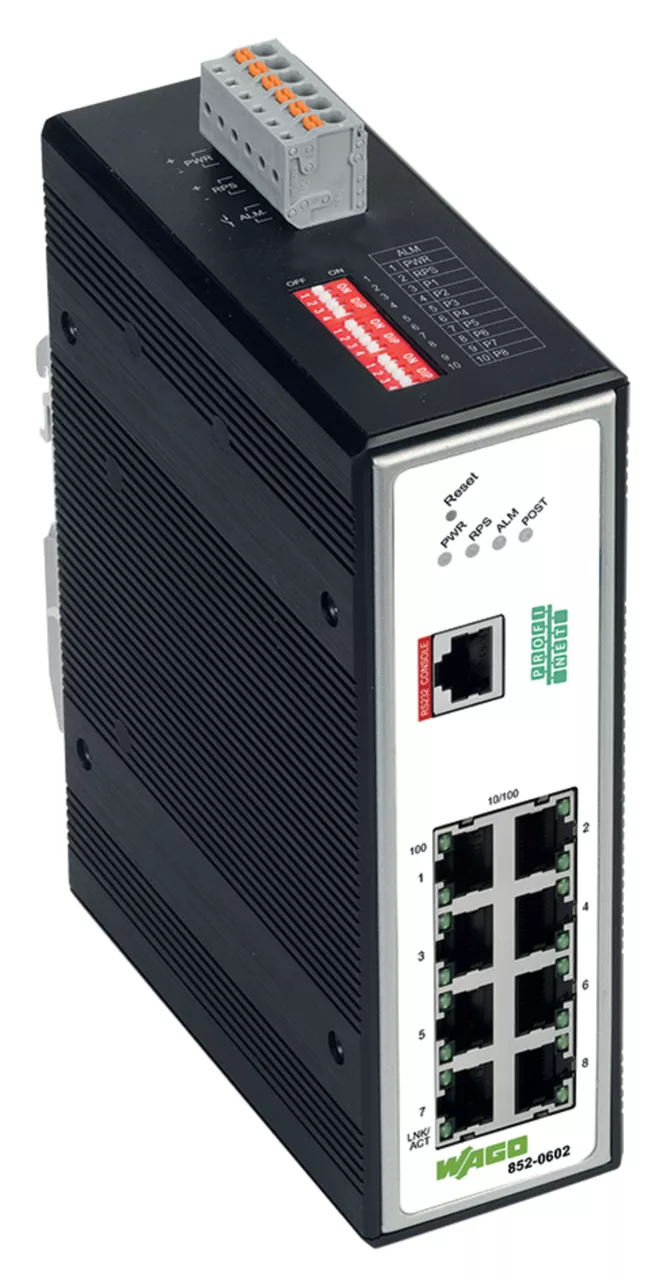 switch przemysłowy zarządzalny; 8 portów 100Base-TX; PROFINET; rozszerzony zakres temperatury; czarny metaliczny