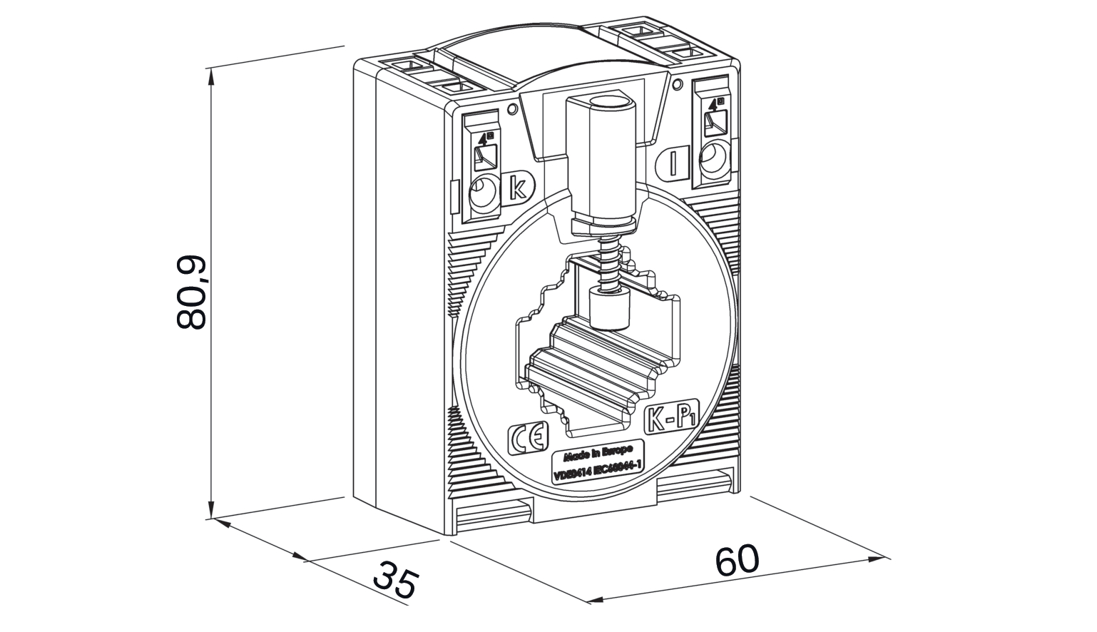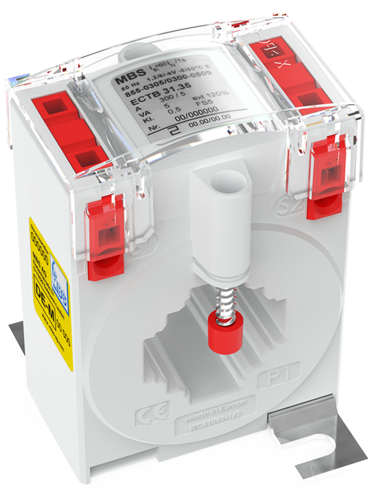 przewlekany przekładnik prądowy; pierwotny prąd znamionowy 100 A; znamionowy prąd wtórny 5 A; moc znamionowa 2,5 VA; klasa dokładności 0,5; z oceną zgodności