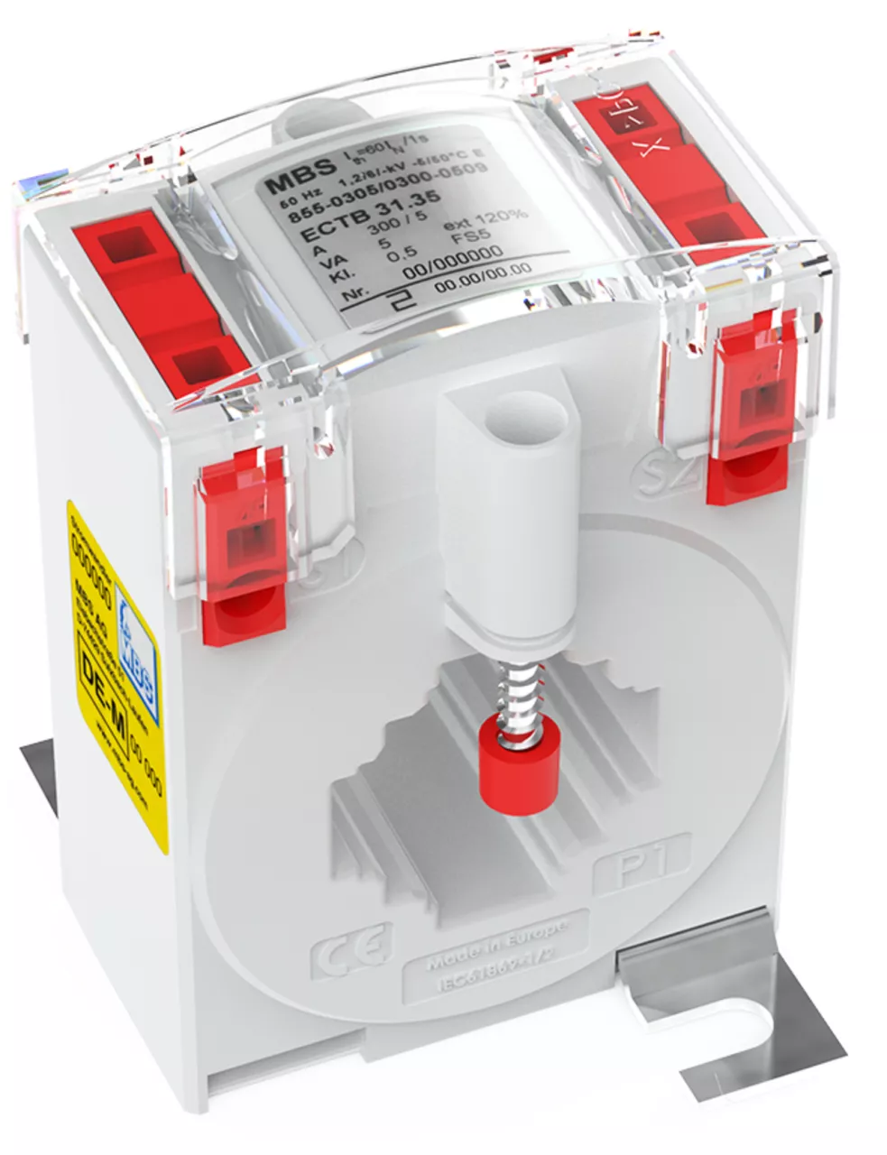 przewlekany przekładnik prądowy; pierwotny prąd znamionowy 600 A; znamionowy prąd wtórny 5 A; moc znamionowa 5 VA; klasa dokładności 0,5; z oceną zgodności
