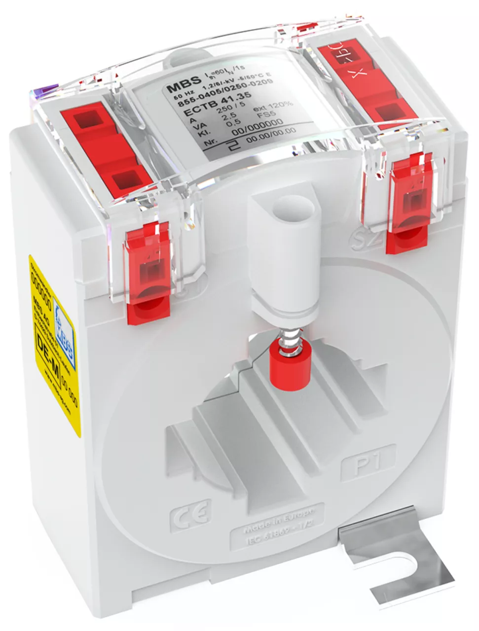 przewlekany przekładnik prądowy; pierwotny prąd znamionowy 250 A; znamionowy prąd wtórny 5 A; moc znamionowa 2,5 VA; klasa dokładności 0,5; z oceną zgodności
