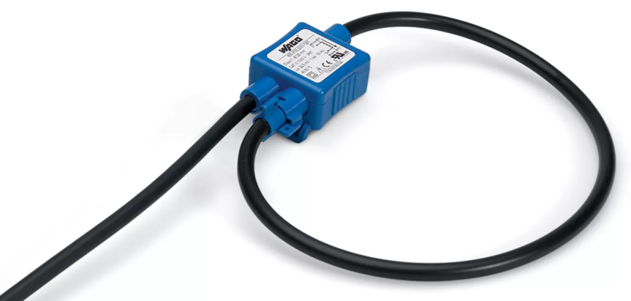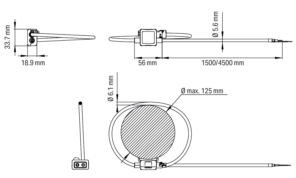 cewka Rogowskiego; pierwotny prąd znamionowy 1000 A; sygnał wyjściowy 22,5 mV na kA; długość przewodu 1,5 m; otwór na przewód pomiarowy 125 mm