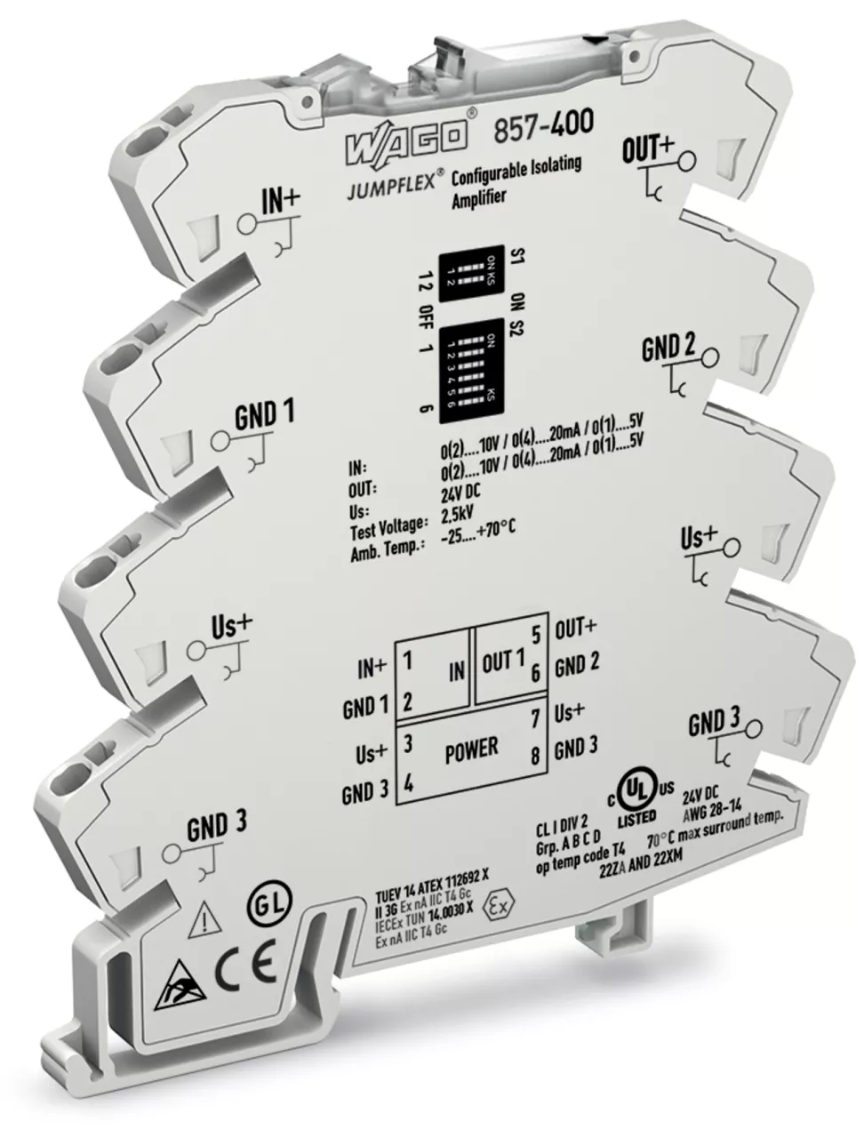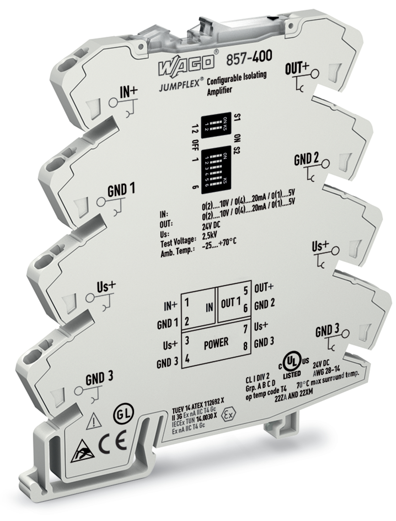 przetwornik separacyjny ze wzmocnieniem; prądowy i napięciowy sygnał wejściowy; prądowy i napięciowy sygnał wyjściowy; kalibracja zera/zakresu; konfiguracja przy pomocy mikroprzełączników DIP; napięcie zasilania 24 V DC; szerokość 6 mm; 2,50 mm²