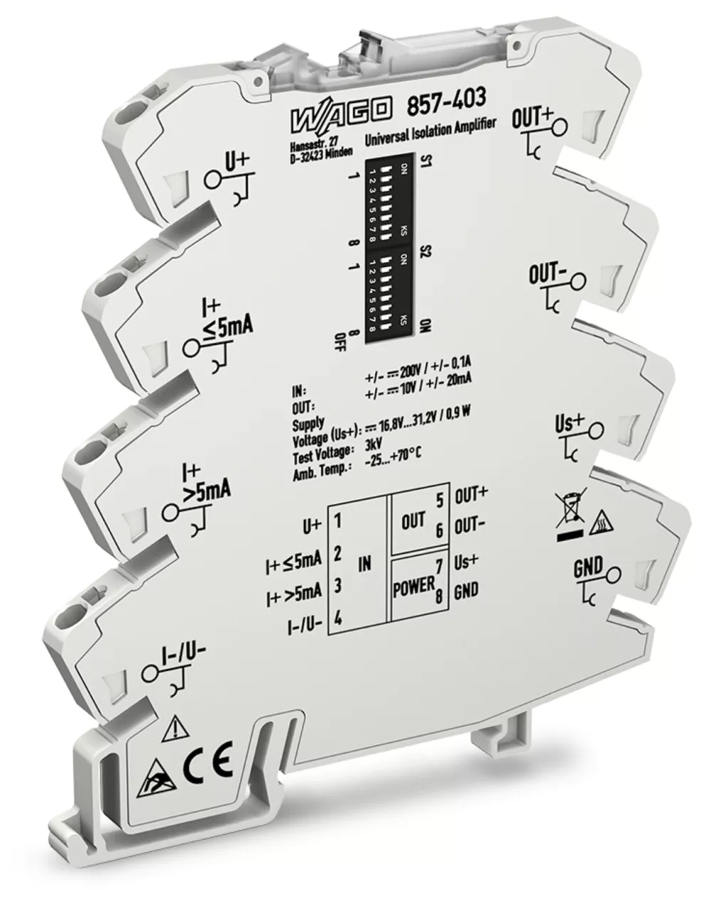 przetwornik separacyjny ze wzmocnieniem; prądowy i napięciowy sygnał wejściowy; bipolarny prądowy i napięciowy sygnał wyjściowy; konfiguracja przy pomocy mikroprzełączników DIP; napięcie zasilania 24 V DC; szerokość 6 mm; 2,50 mm²