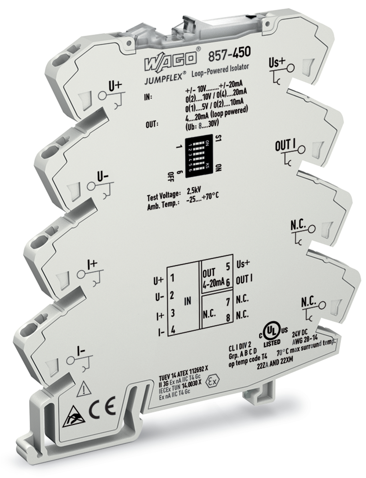 przetwornik zasilany z pętli wyjściowej; bipolarny prądowy i napięciowy sygnał wejściowy; prądowy sygnał wyjściowy; konfiguracja przy pomocy mikroprzełączników DIP; zasilanie na wyjściu; szerokość 6 mm; 2,50 mm²