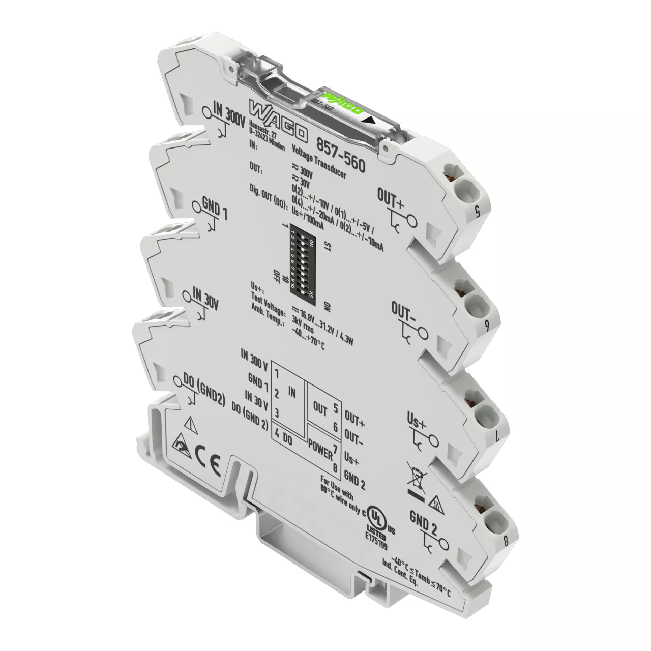 przetwornik pomiarowy napięcia; napięciowy sygnał wejściowy; prądowy i napięciowy sygnał wyjściowy; moduł wyjść dwustanowych; konfiguracja przy użyciu oprogramowania; napięcie zasilania 24 V DC; szerokość 6 mm
