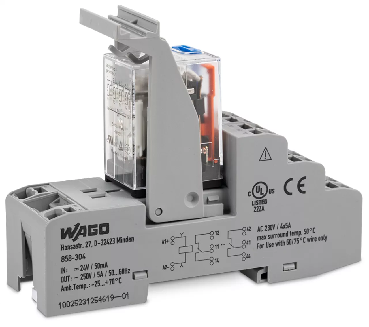przekaźnik; znamionowe napięcie wejściowe 220 V DC; 4 x zestyk przełączny; maksymalny prąd długotrwały 5 A; z ręcznym pobudzeniem; sygnalizacja statusu czerwony; szerokość 31 mm