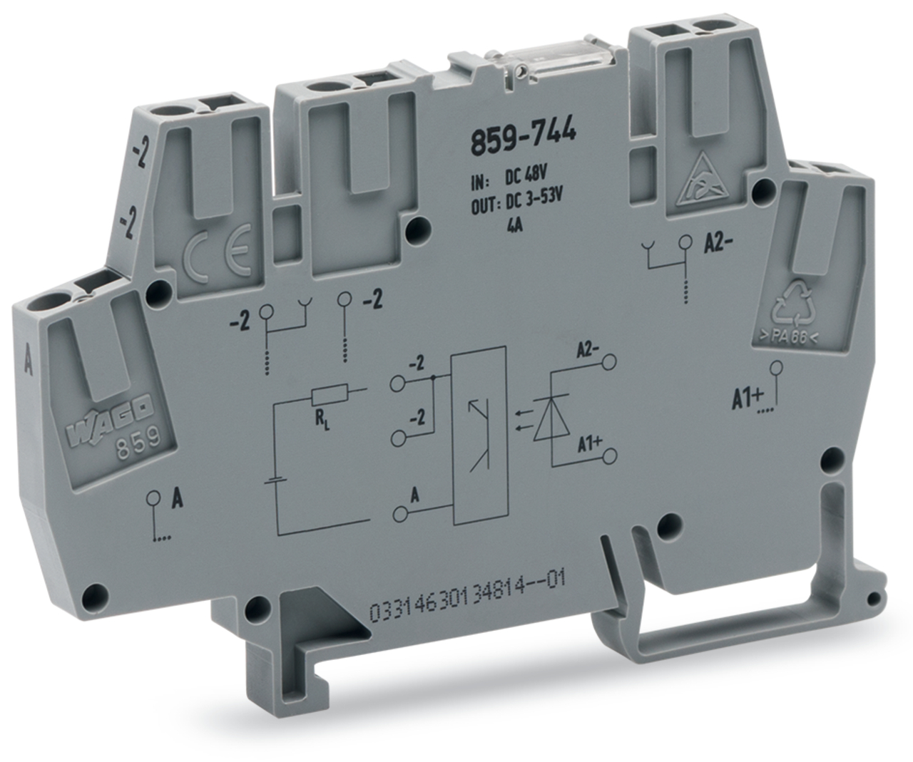 optoseparator; znamionowe napięcie wejściowe 12 … 48 V DC; zakres napięcia wyjściowego 3 … 53 V DC; maksymalny prąd długotrwały 4 A; podłączanie 2-przewodowe; szerokość 6 mm; szary