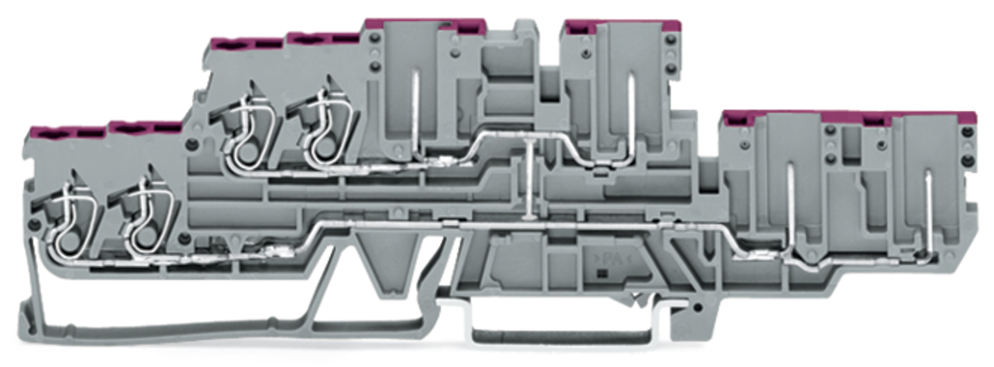 zł. bazowa 4-przew./4-pinowa 2-piętrowa; złączka przelotowa 4-przewodowa/4-pinowa; 2,5 mm²; L; z mostkowaniem wewnętrznym; otwory na przewody z fiolet. nadrukiem; na szynę TS 35 x 15 i 35 x 7,5; CAGE CLAMP®; 2,50 mm²; szary