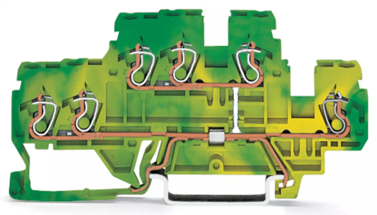złączka 3-przewodowa 2-piętrowa; złączka PE 6-przewodowa; 2,5 mm²; PE; z mostkowaniem wewnętrznym; na szynę TS 35 x 15 i 35 x 7,5; CAGE CLAMP®; 2,50 mm²; żółto-zielony