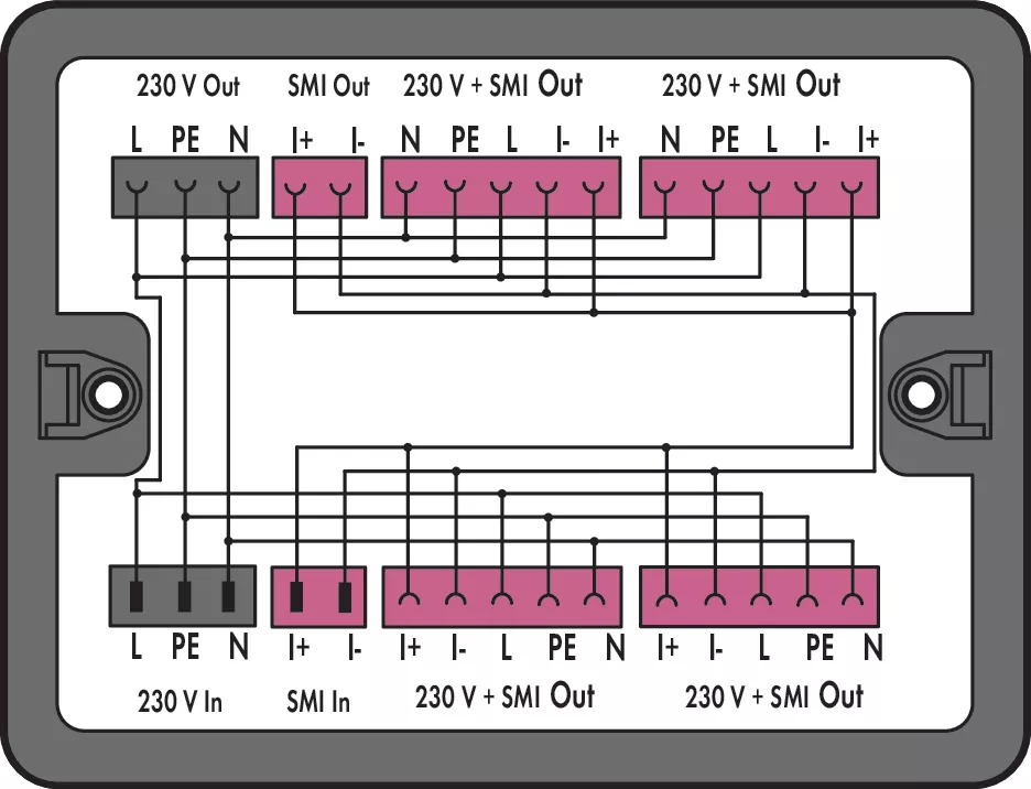 skrzynka rozdzielcza; 230 V + SMI; 2 wejścia; 6 wyjść; kodowanie A, B; MINI, MIDI; czarny