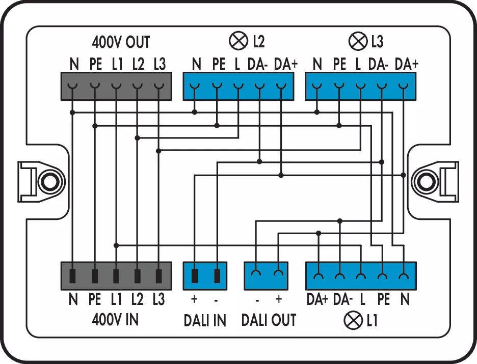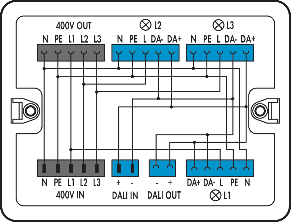 skrzynka rozdzielcza; 400 V + DALI; 2 wejścia; 5 wyjść; kodowanie A, I; MINI, MIDI; biały