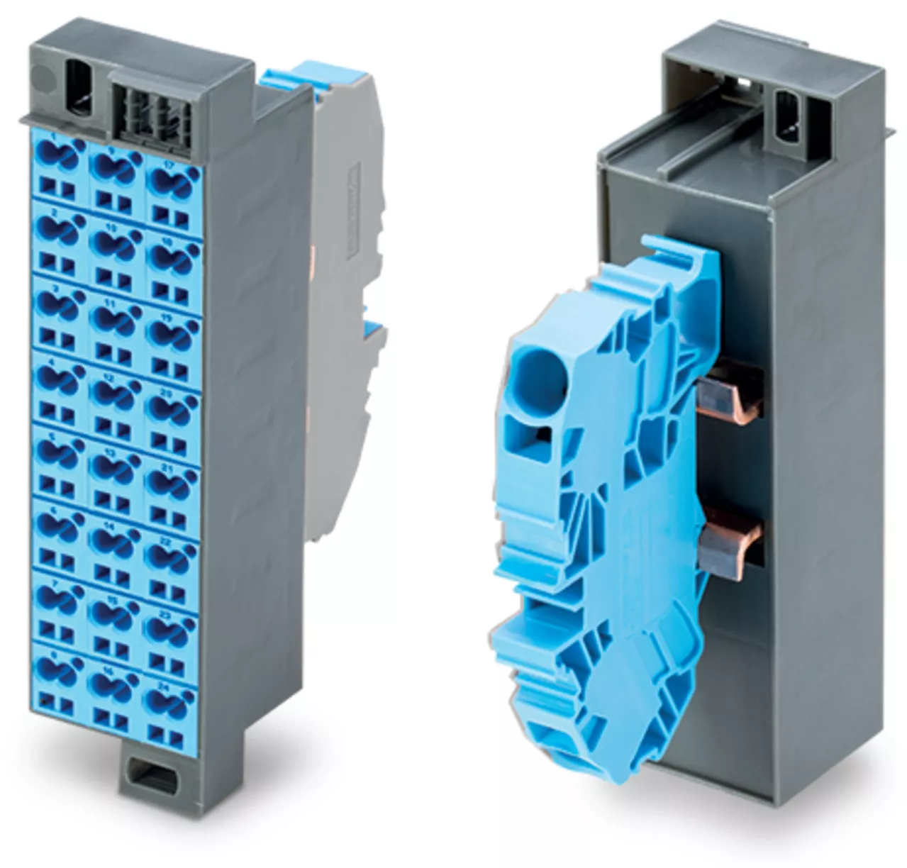 blok potencjałowy; nadruk 1 ... 24; z 1 złączką zasilającą ze ścianką końcową; kolor kostek niebieski; numeracja kostek w pionie; do ram 19''; wąska obudowa; niebieski/ciemnoszary