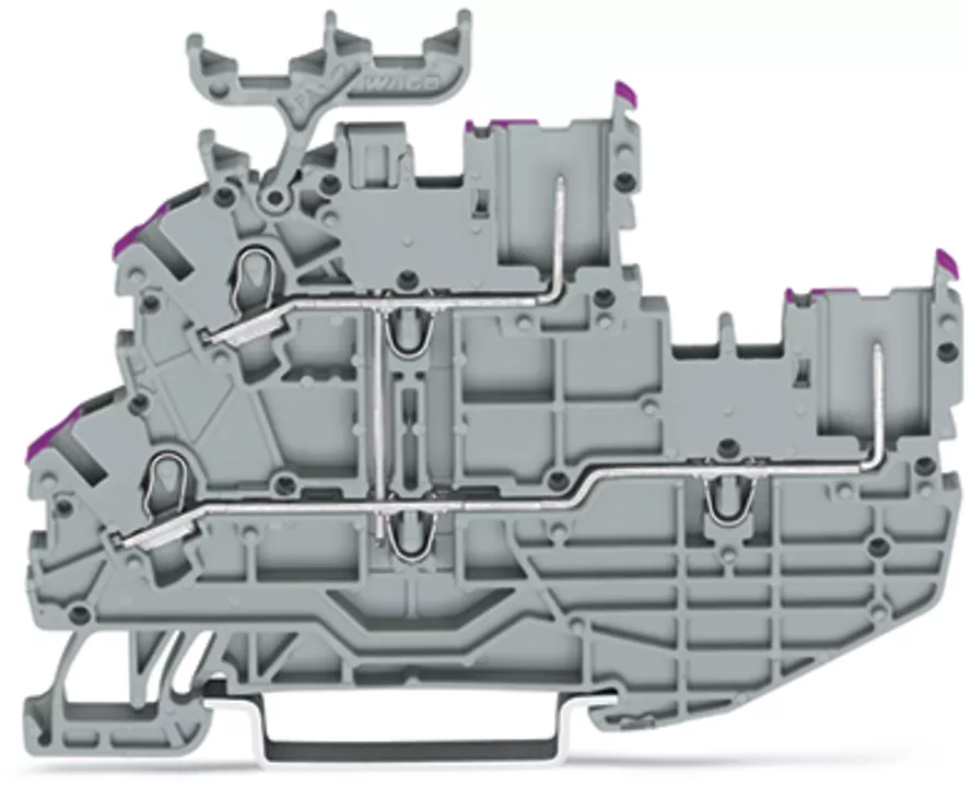 złączka bazowa 2-piętrowa 2-przewodowa/2-pinowa; złączka przelotowa 2-przewodowa/2-pinowa; L/L; z mostkowaniem wewnętrznym; otwory na przewody z fiolet. nadrukiem; na szynę TS 35 x 15 i 35 x 7,5; Push-in CAGE CLAMP®; 1,00 mm²; szary