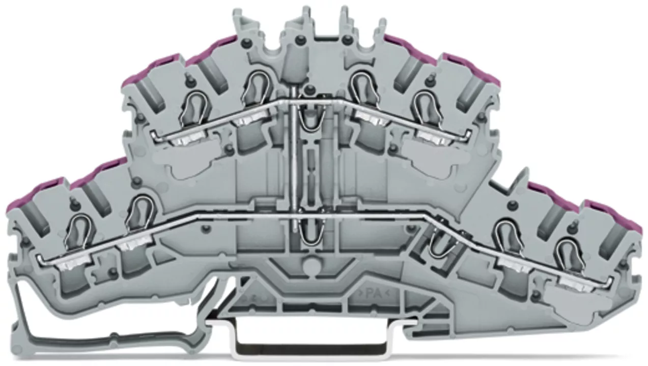 złączka 2-piętrowa 4-przewodowa; złączka przelotowa 8-przewodowa; L; bez podstawki oznacznika; z mostkowaniem wewnętrznym; otwory na przewody z fiolet. nadrukiem; na szynę TS 35 x 15 i 35 x 7,5; 2,5 mm²; Push-in CAGE CLAMP®; 2,50 mm²; szary