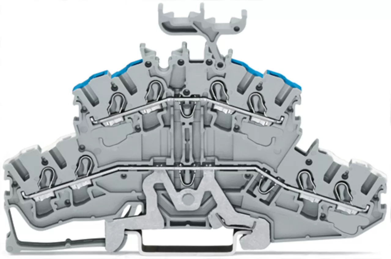 złączka 2-piętrowa 4-przewodowa; złączka do ekranu/przelotowa; 2,5 mm²; ekranowanie/N; bez podstawki oznacznika; otwory na przewody piętro, nadruk nieb.; na szynę TS 35 x 15 i 35 x 7,5; Push-in CAGE CLAMP®; 2,50 mm²; szary