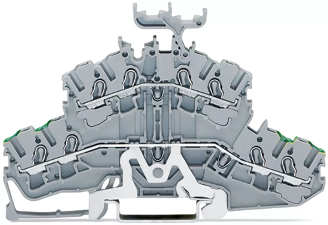 złączka 2-piętrowa 4-przewodowa; złączka PE/przelotowa; 2,5 mm²; PE/L; z podstawką oznacznika; otwory na przewody piętro, nadruk nieb.; na szynę TS 35 x 15 i 35 x 7,5; Push-in CAGE CLAMP®; 2,50 mm²; szary