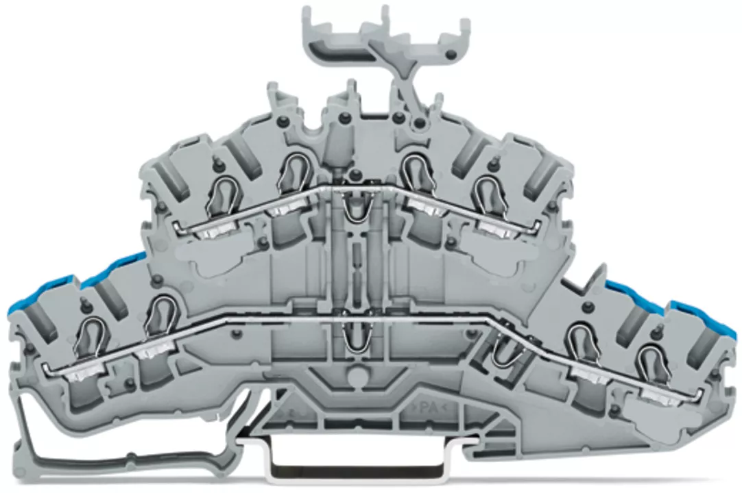 złączka 2-piętrowa 4-przewodowa; złączka przelotowa/przelotowa; N/L; z podstawką oznacznika; otwory na przewody, parter, nadruk nieb.; na szynę TS 35 x 15 i 35 x 7,5; 2,5 mm²; Push-in CAGE CLAMP®; 2,50 mm²; szary