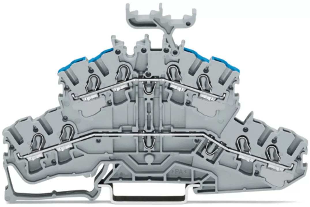 złączka 2-piętrowa 4-przewodowa; złączka przelotowa/przelotowa; L/N; z podstawką oznacznika; otwory na przewody piętro, nadruk nieb.; na szynę TS 35 x 15 i 35 x 7,5; 2,5 mm²; Push-in CAGE CLAMP®; 2,50 mm²; szary