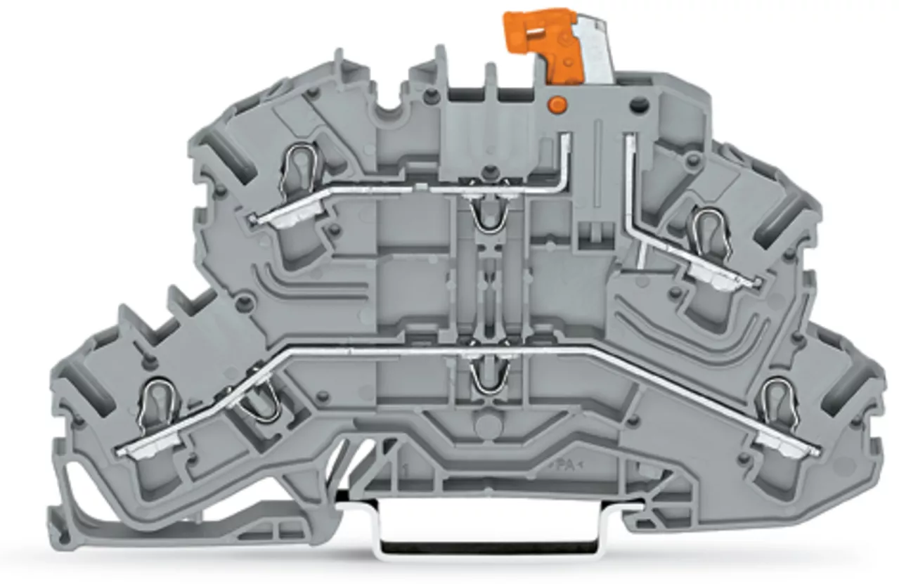 złączka rozłączalna 2-piętrowa; z uchylnym łącznikiem nożowym; L/L; na szynę TS 35 x 15 i 35 x 7,5; 2,5 mm²; Push-in CAGE CLAMP®; 2,50 mm²; szary