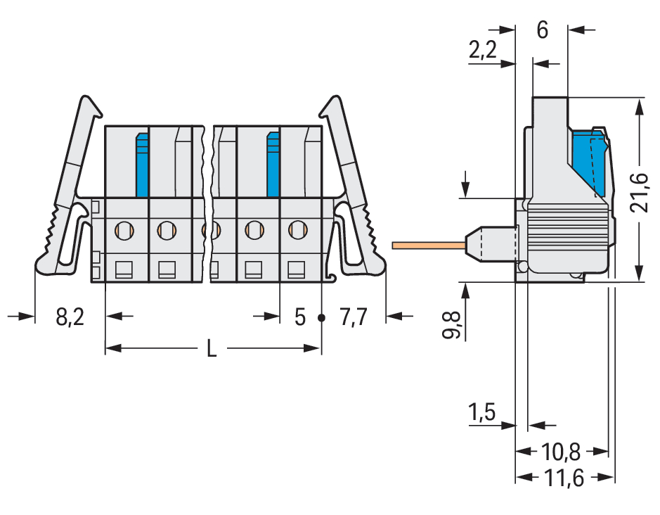 gniazdo do złączek listwowych; piny 0,6 x 1 mm; konstrukcja kątowa; 100% ochrona przed błędnym połączeniem; zaczep ryglujący; raster 5 mm; 3-bieg.; jasnoszary