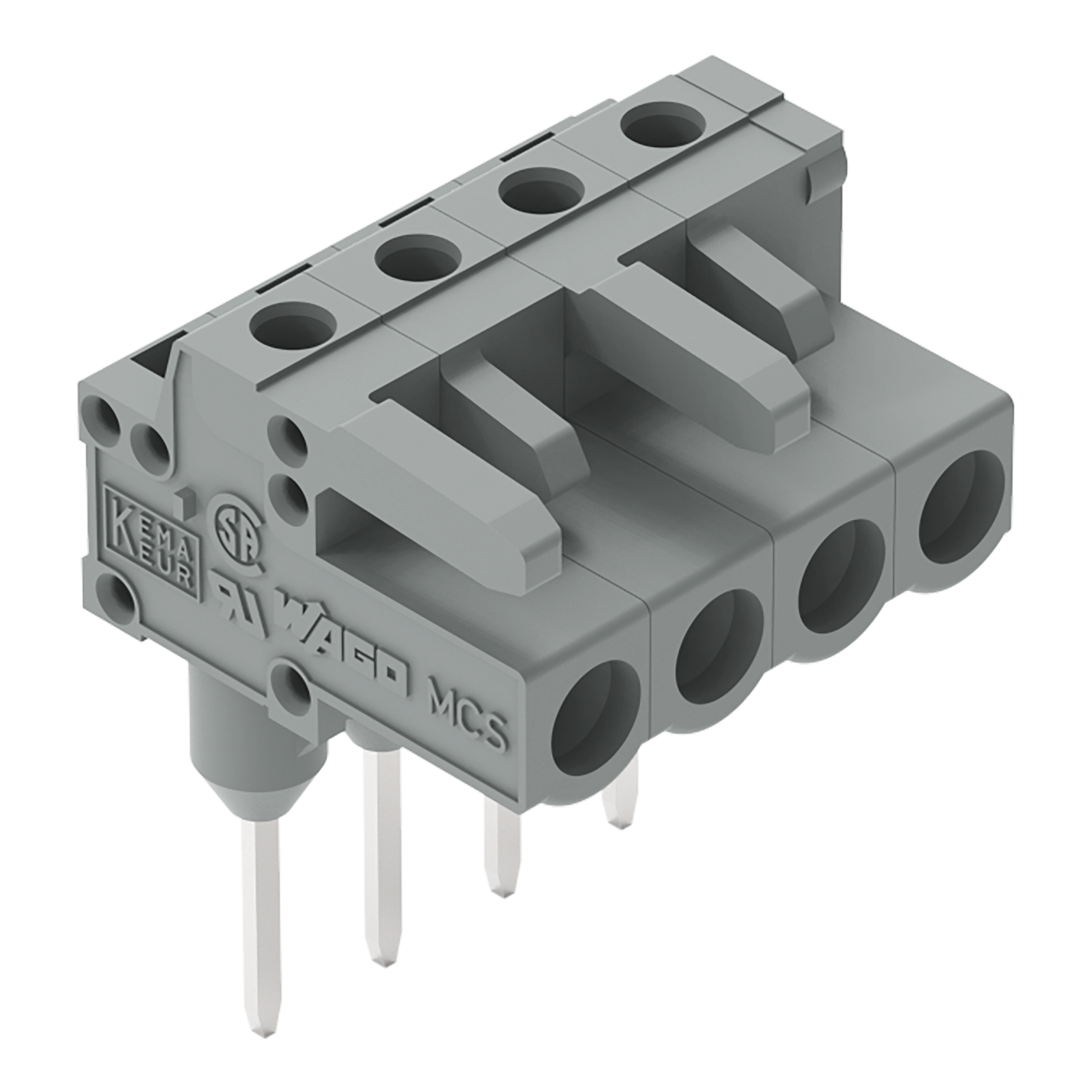 gniazdo do złączek listwowych; piny 0,6 x 1 mm; konstrukcja kątowa; raster 5 mm; 4-bieg.; szary
