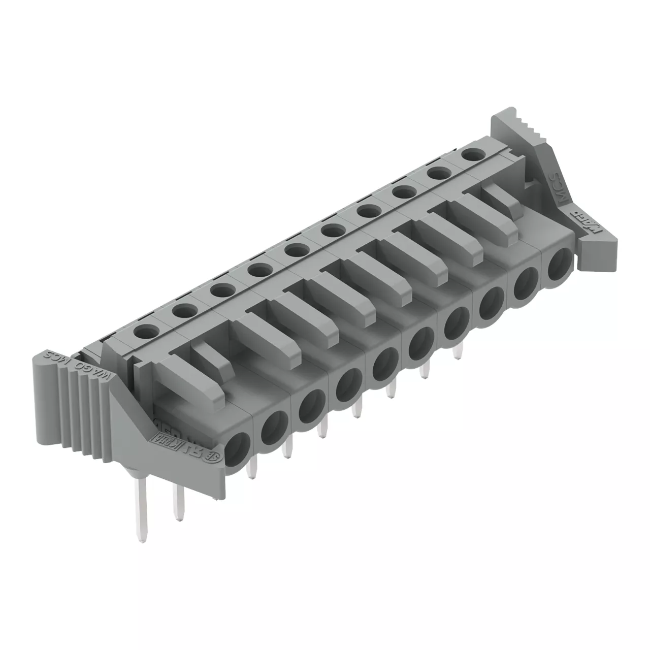 gniazdo do złączek listwowych; piny 0,6 x 1 mm; konstrukcja kątowa; zaczep ryglujący; raster 5 mm; 10-bieg.; szary