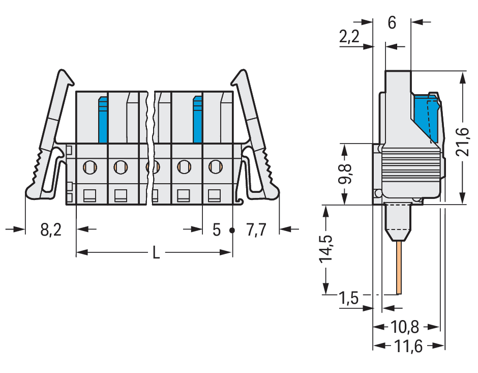 gniazdo do złączek listwowych; piny 0,6 x 1 mm; konstrukcja prosta; 100% ochrona przed błędnym połączeniem; zaczep ryglujący; raster 5 mm; 10-bieg.; jasnoszary