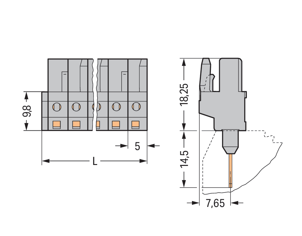 Gniazda do złączek listwowych Piny 0,6 x 1 mm konstrukcja prosta, szara 232-150/005-000