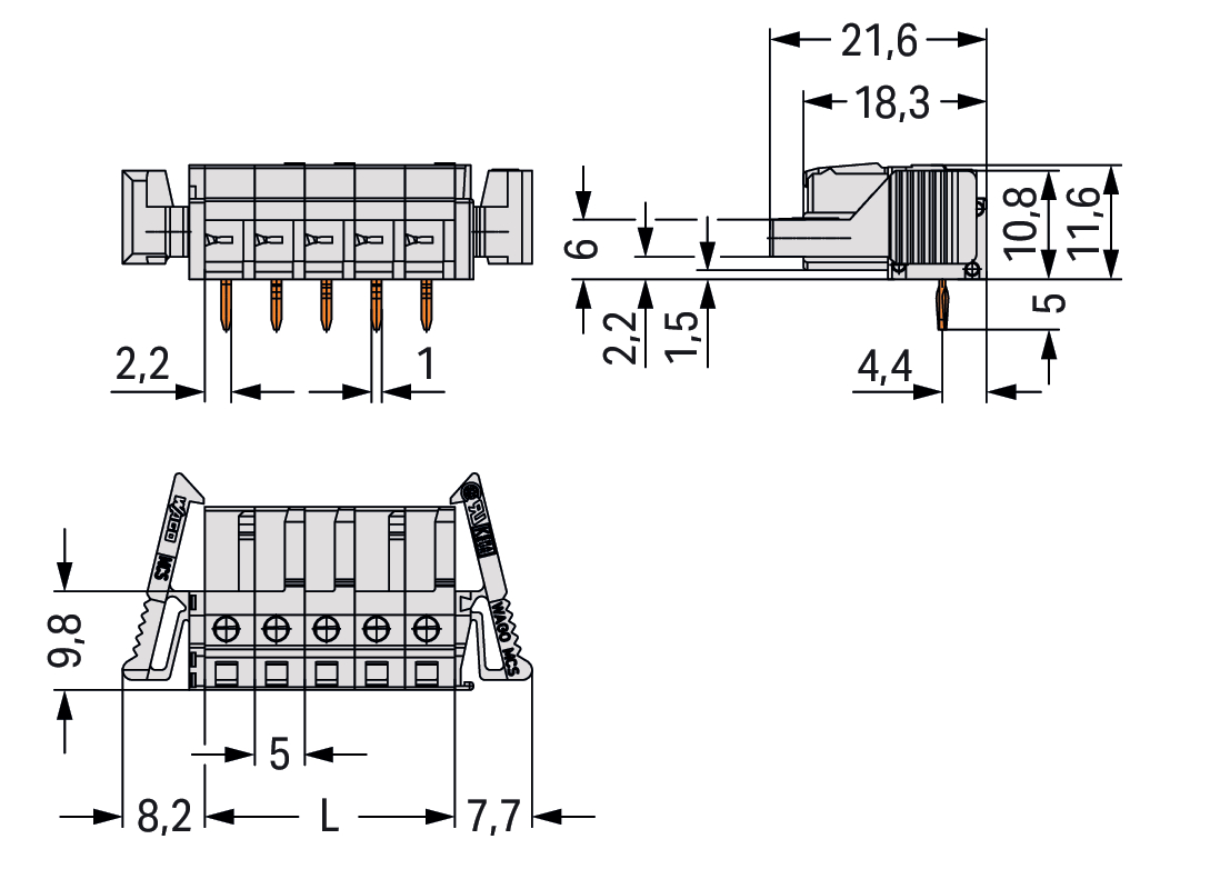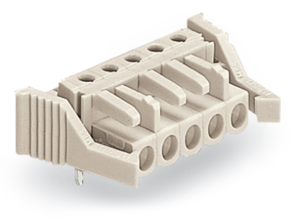gniazdo THT; konstrukcja kątowa; raster 5 mm; 9-bieg.; 100% ochrona przed błędnym połączeniem; zaczep ryglujący; pin lutowniczy 0,6 x 1,0 mm; jasnoszary