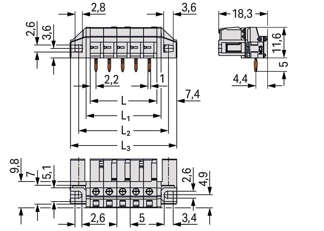 gniazdo THT; konstrukcja kątowa; raster 5 mm; 12-bieg.; 100% ochrona przed błędnym połączeniem; dystansowy uchwyt montażowy; pin lutowniczy 0,6 x 1,0 mm; jasnoszary