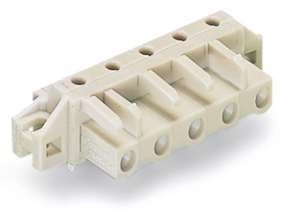 gniazdo THT; konstrukcja kątowa; raster 7,5 mm; 5-bieg.; 100% ochrona przed błędnym połączeniem; kołnierz mocujący; pin lutowniczy 0,6 x 1,0 mm; jasnoszary