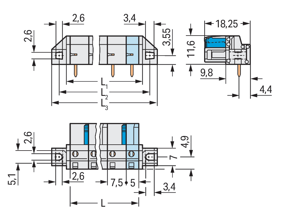 Gniazdo THT Pin lutowniczy 0,6 x 1,0 mm konstrukcja kątowa, jasnoszare 722-840/031-000